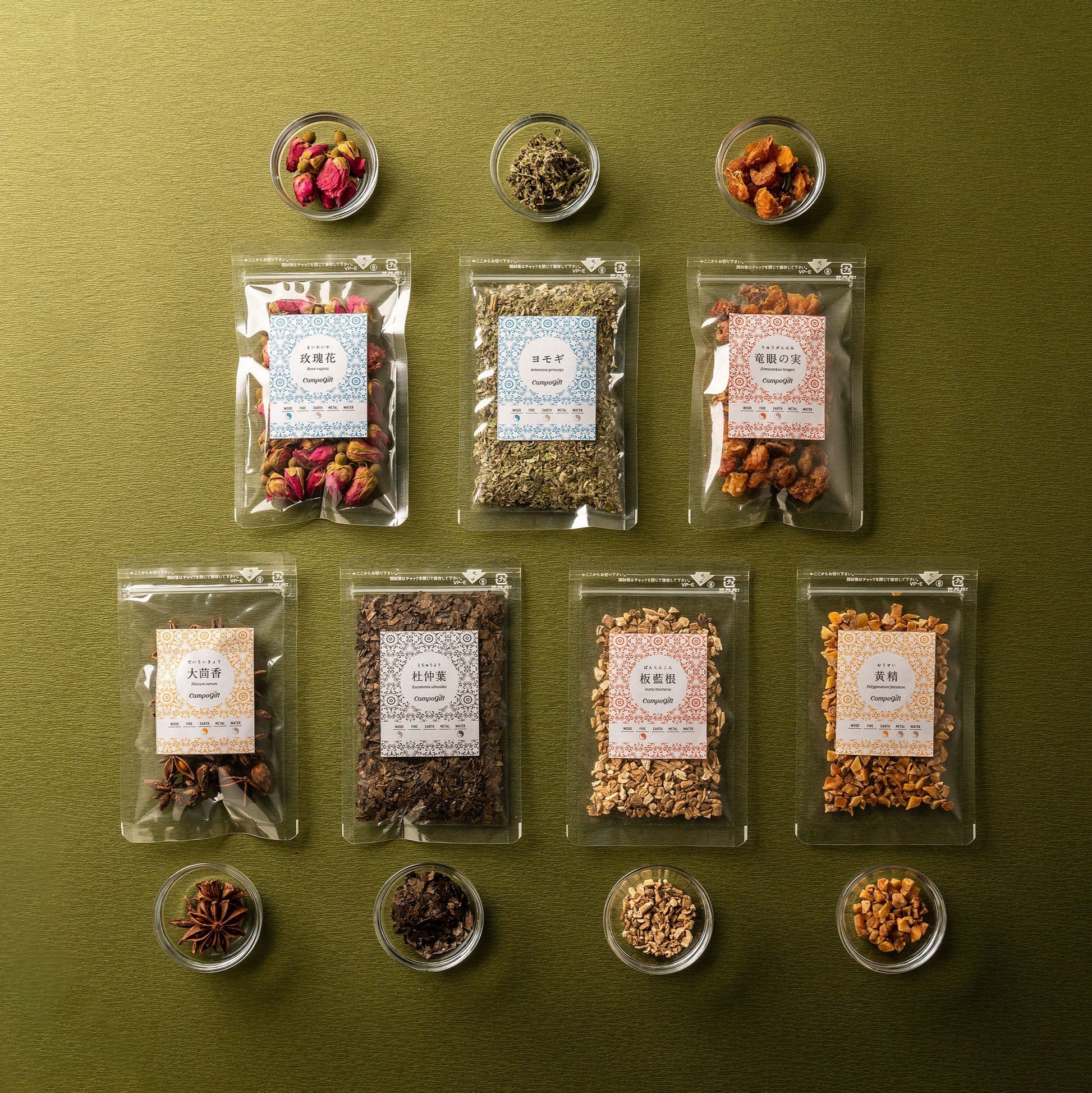 ( ヨモギ10g /杜仲葉20g/大茴香15g /竜眼の実20g /玫瑰花15g /黄精20g /板藍根20g )